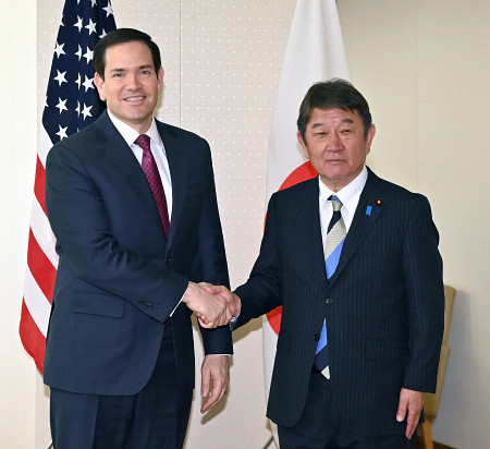 茂木敏充外相(右)は28日、来日中のルビオ米国務長官と外務省で就任後初めて会談し、日米同盟の抑止力・対処力を強化することで一致した。経済安全保障分野の連携を進めることも確認した。(代表撮影) 【時事通信社】