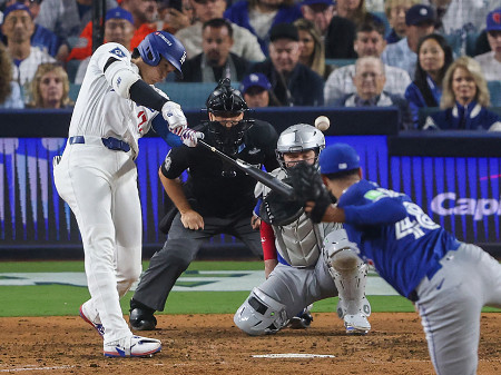 米大リーグのワールドシリーズ。ドジャースがブルージェイズに延長18回の末、6―5でサヨナラ勝ちした。対戦成績はドジャースの2勝1敗となった。写真は7回、同点のソロ本塁打を放つ大谷=27日、ロサンゼルス 【AFP時事】