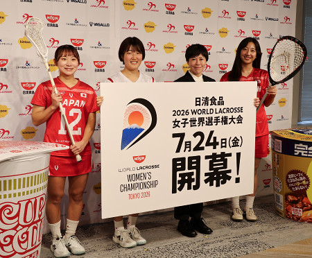 日本ラクロス協会は15日、7月に東京で開幕する女子世界選手権の概要や代表チームの取り組みを発表した。写真は、ラクロス女子の藤田瑠奈(右端)、宮沢明日香ヘッドコーチ(右から2人目)ら。 【時事通信社】