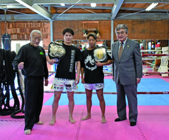加藤育男福生市長が1月9日、橋本道場(福生市福生)を訪れ、第6代RISEフェザー級王者の安本晴翔選手と第3代RISEスーパーフライ級王者の花岡竜選手を激励した。