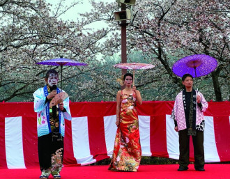 羽村の親水公園(羽村市羽中)などで開催中の「はむら花と水のまつり」のステージで4月4日、「かんざしJAPAN」の着物リメークドレスショーが開かれた。
