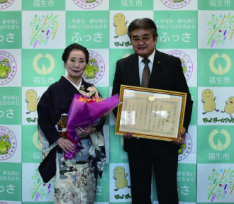 10月11日に防衛大臣感謝状を受賞した福生市の日本舞踊家・花柳千衛里さんが12月15日、加藤育男福生市長を表敬訪問し、受賞を報告した。